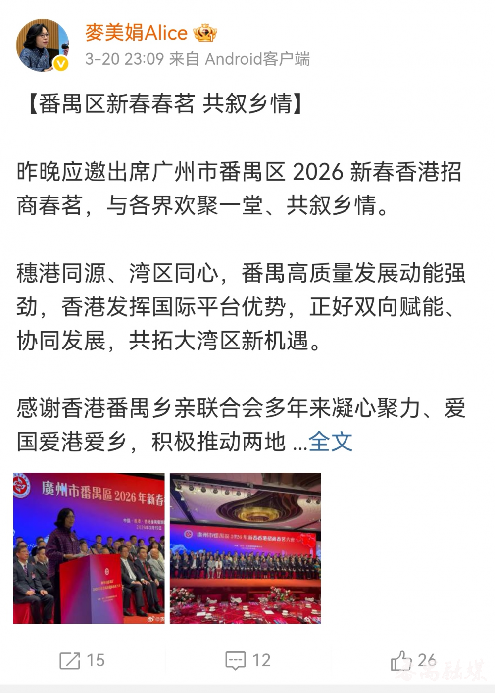 “穗港同源、灣區同心,番禺高質量發展動能強勁,香港發揮國際平臺優勢,正好雙向賦能、協同發展,共拓大灣區新機遇。”香港民政及青年事務局局長麥美娟在微博上寫下的這段話,道出了兩地合作的底層邏輯——不是簡單的資源轉移,而是優勢互補、雙向奔赴。她觀察到,番禺近年全力推進先進制造、文商旅融合等領域的發展,有望成為大灣區文商旅時尚業的交流高地。“新一年,我們繼續攜手深化穗港產業合作、青年交流、招商引資,助力企業融灣出海、青年追夢灣區,共促高質量發展。”麥美娟的話語中,既有對過去的肯定,更有對未來的篤定。