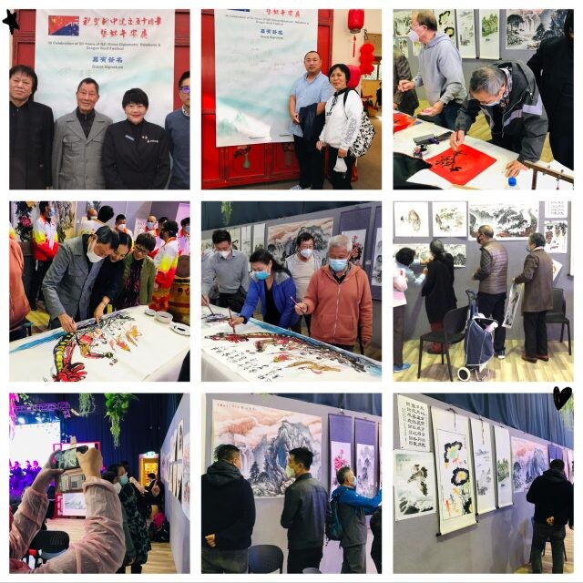 2022年是新西蘭同中國建交五十周年,新西蘭30多個社團喜迎新西蘭中國建交五十周年和華人傳統端午節,舉辦民間的歡樂活動,以此祝賀新西蘭中國友誼萬載長青!祝賀新西蘭各民族戰勝疫情,身強力壯,共同安康!這次活動由新西蘭中華文化藝術學院區本院長、廖小雪主席、余超總經理發起,聯合了30多個社團舉辦了這次很有意義的大型書畫展,嘉賓和畫家們互動揮毫潑墨畫龍舟、醒獅,還有音樂彈唱、獨唱、相聲、舞蹈、魔術表演和有獎問答活動。活動由學院常務副院長蘇睿慧、學院委員溫嘉寶主持,學院拍攝部長陳智輝負責臺前幕后制作,整個活動場面非常精彩,展出了70多幅作品,好戲連臺。200多華人華僑參加共同慶祝,活動取得圓滿成功。(新西蘭中華文化藝術學院)