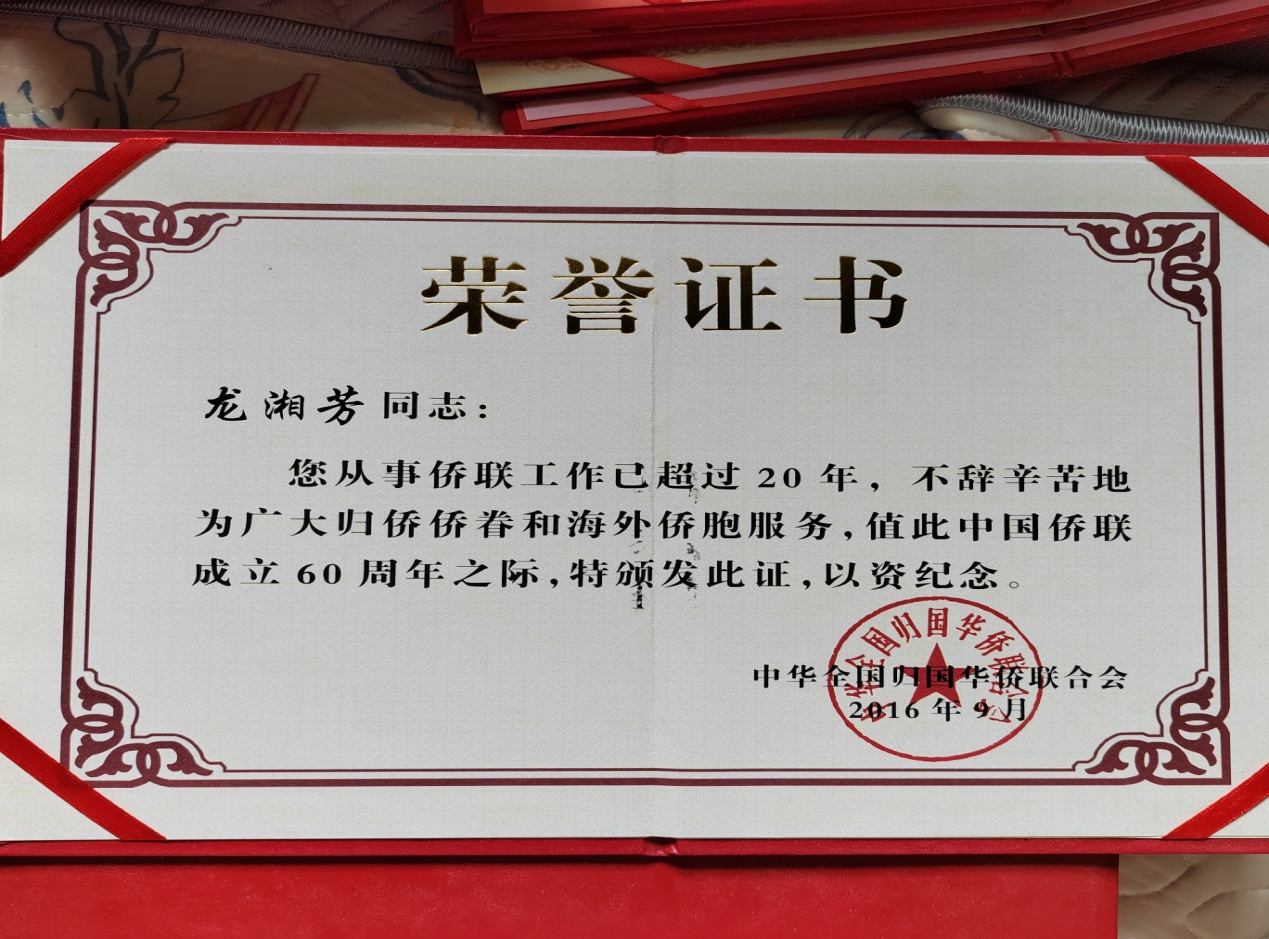 龍湘芳獲2009年、2013年、2016年“全國歸僑僑眷先進個人”榮譽稱號