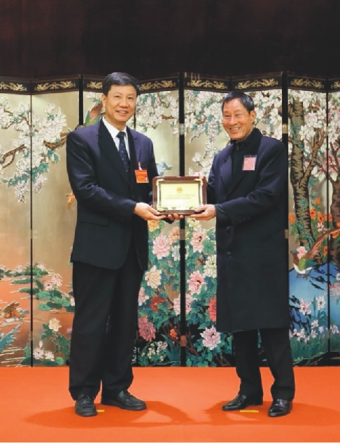 2018年時任廣州市人大常委會主任陳建華(左)向區本先生頒發人大會議證書