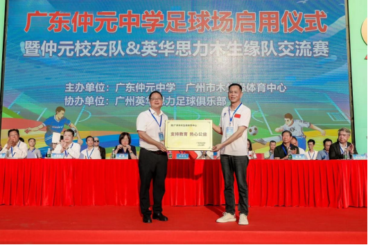 馮慶華(圖右)向廣東仲元中學捐贈交付標準足球場,學校回贈“支持教育 熱心公益”牌匾