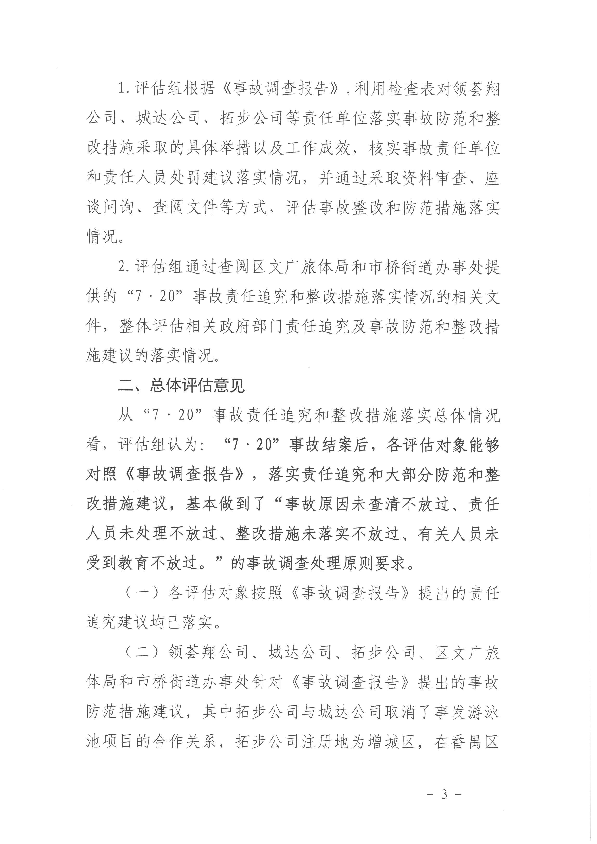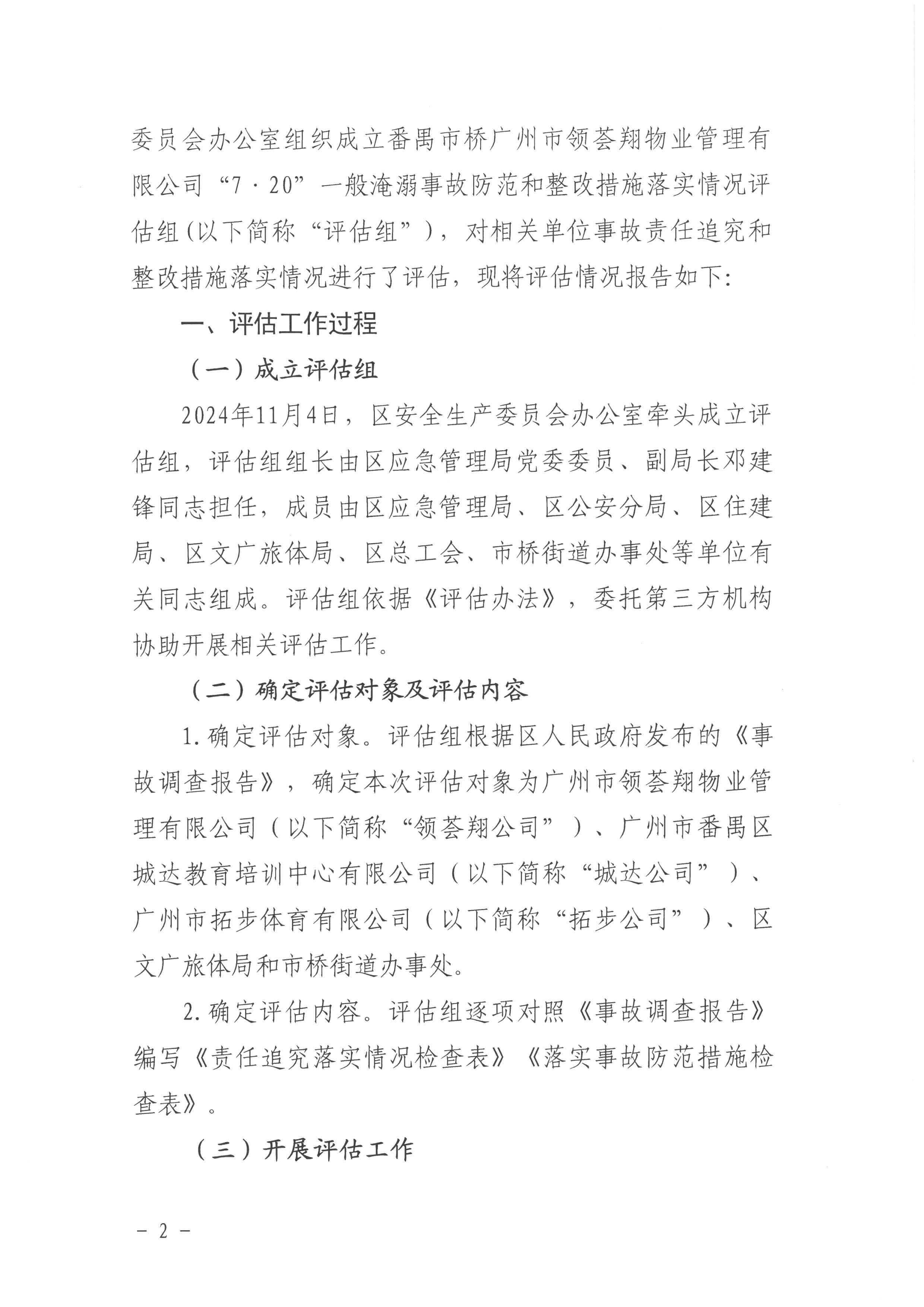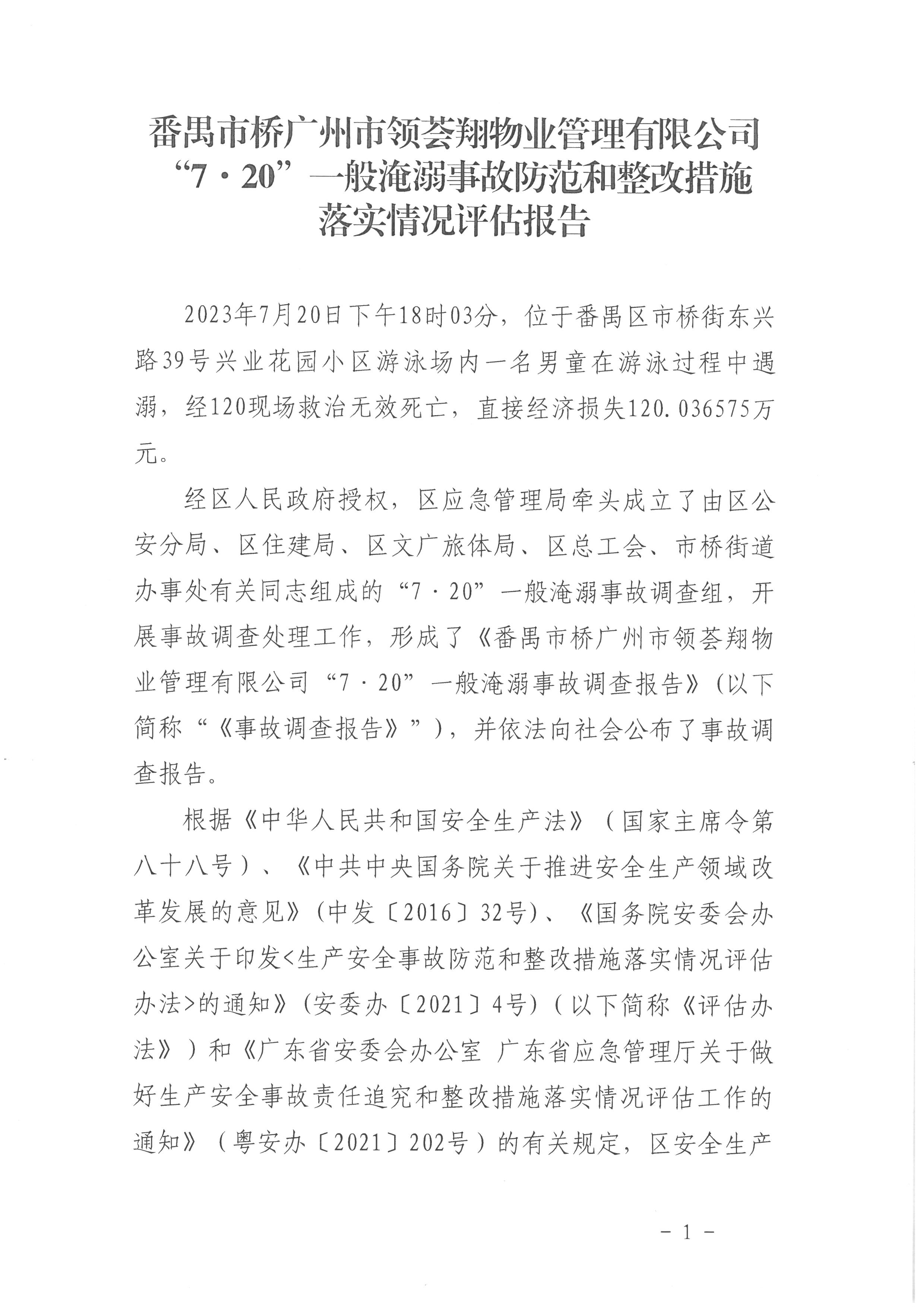 番禺市橋廣州市領(lǐng)薈翔物業(yè)管理有限公司“7·20”一般淹溺事故防范和整改措施落實情況評估報告