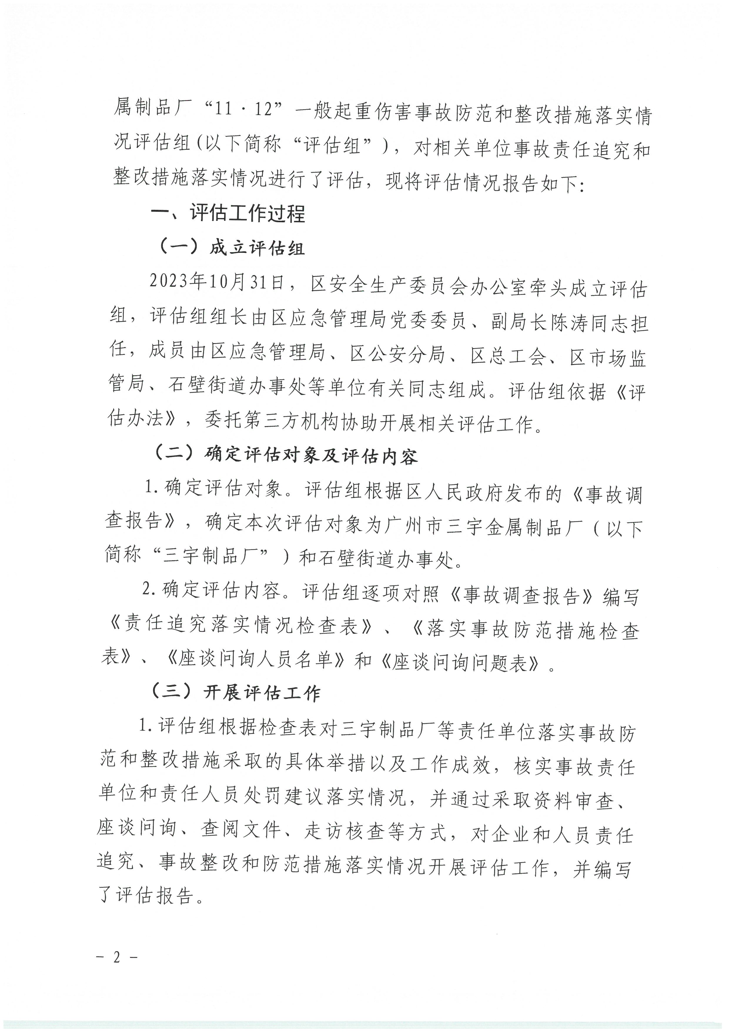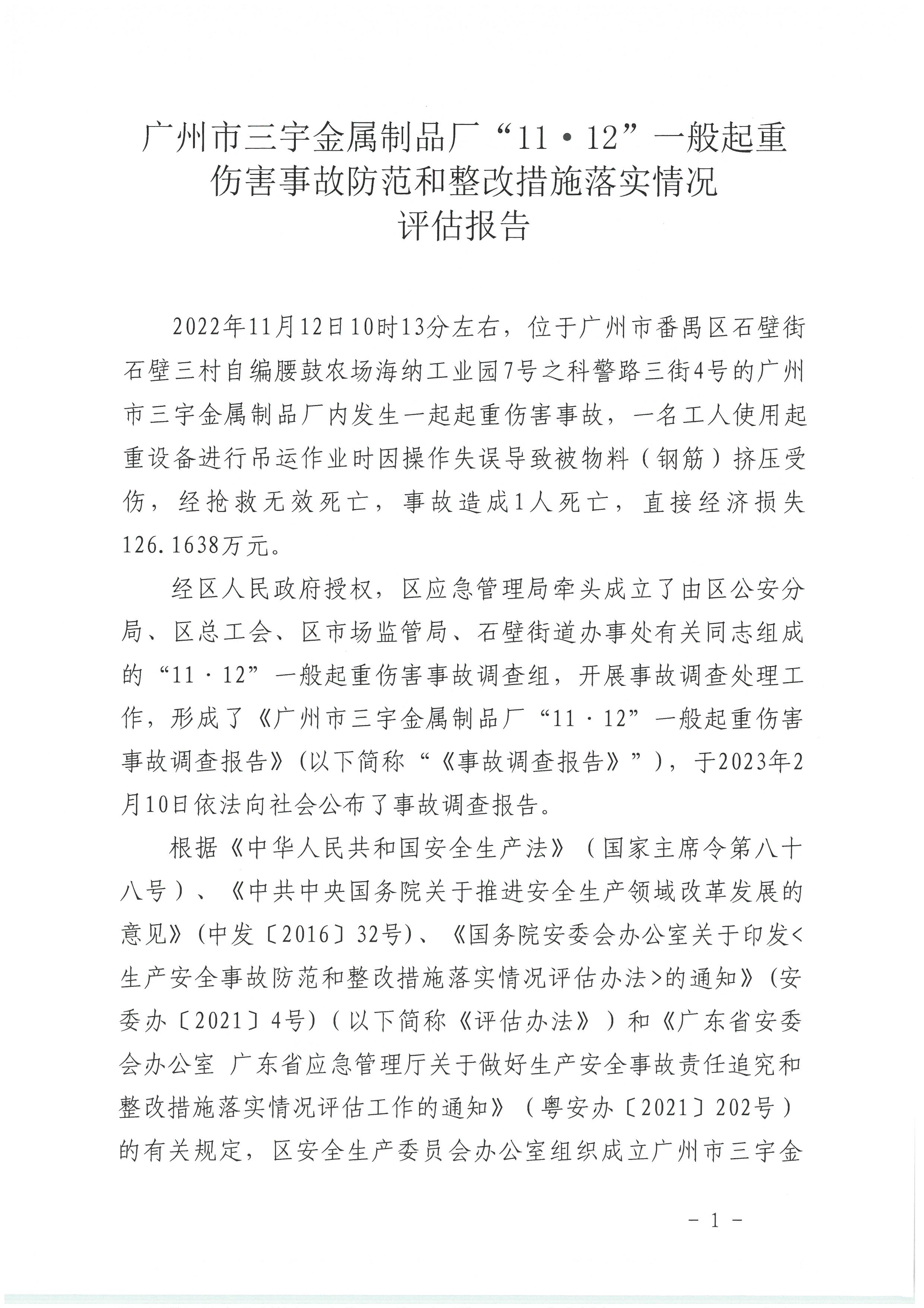廣州市三宇金屬制品廠“11·12”一般起重傷害事故防范和整改措施落實情況評估報告