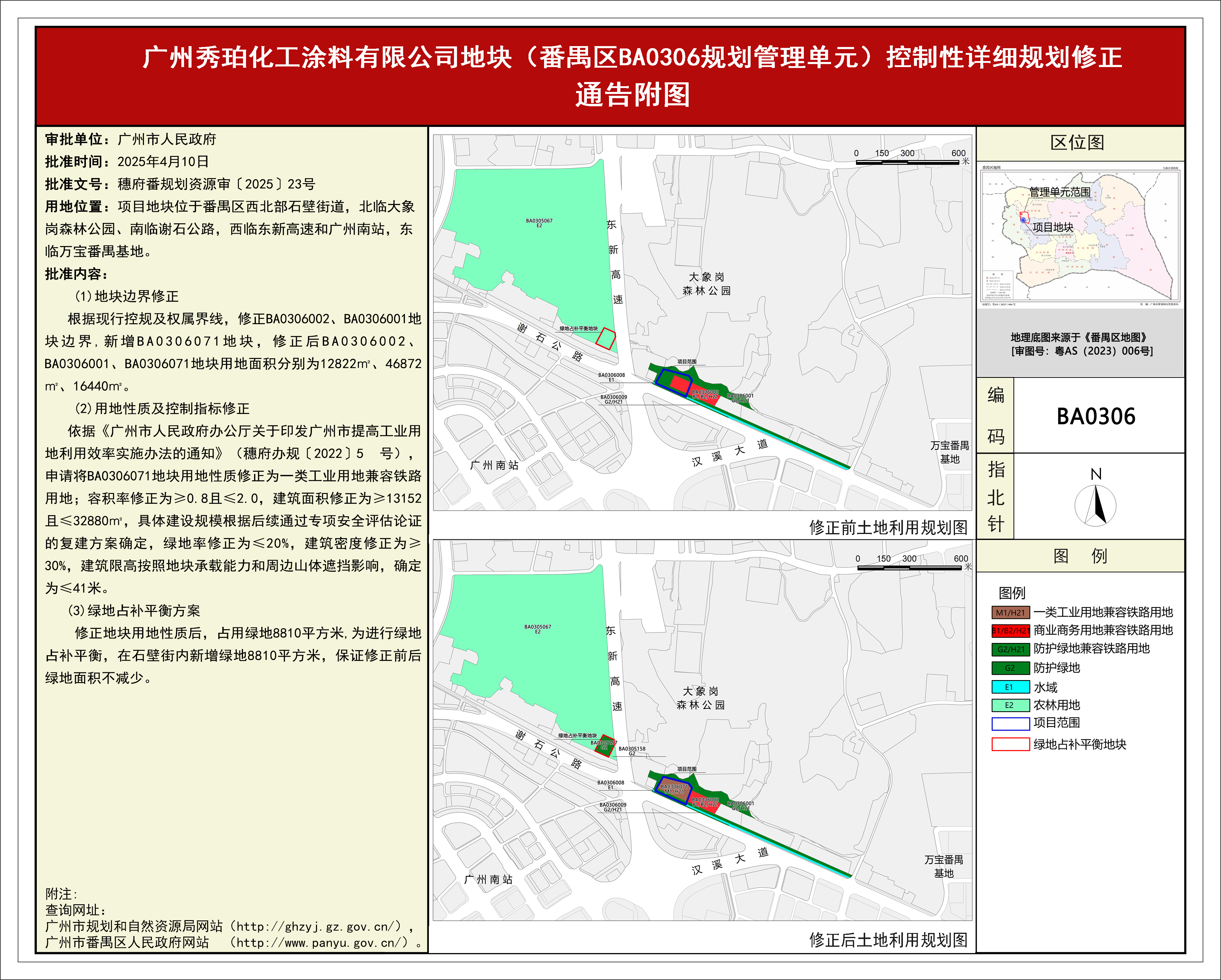 根據《廣東省城市控制性詳細規劃管理條例》、《廣州市人民政府關于將一批市級行政職權事項繼續委托區實施的決定》(穗府〔2019〕8號)、《廣州市人民政府關于收回一批市級行政權力事項的決定》(廣州市人民政府令第188號),《廣州秀珀化工涂料有限公司地塊(番禺區BA0306規劃管理單元)控制性詳細規劃修正》規劃成果已完成批前公示、征詢相關單位意見等程序,并經區政府常務會議紀要十八屆138次審議通過后,獲廣州市人民政府批準(穗府番規劃資源審〔2025〕23號),自批準之日(2025年4月10日)起生效。