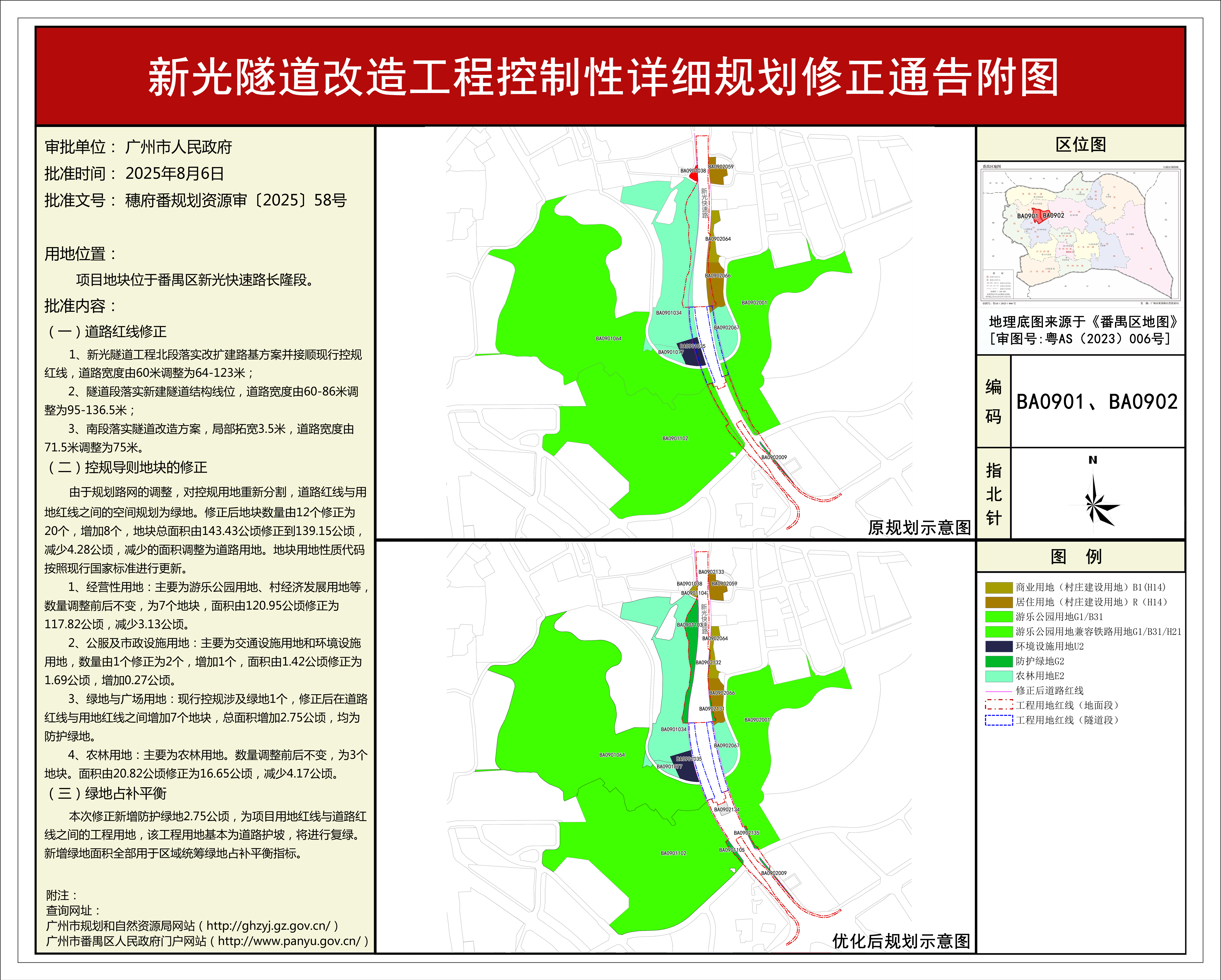 根據《廣東省城市控制性詳細規劃管理條例》、《廣州市人民政府關于將一批市級行政職權事項繼續委托區實施的決定》(穗府〔2019〕8號),《新光隧道改造工程控制性詳細規劃修正》規劃成果已完成規劃技術審查、批前公示等程序,并經番禺區政府常務會議審議通過后獲廣州市人民政府批準,自批準之日(2025年8月6日)起生效。