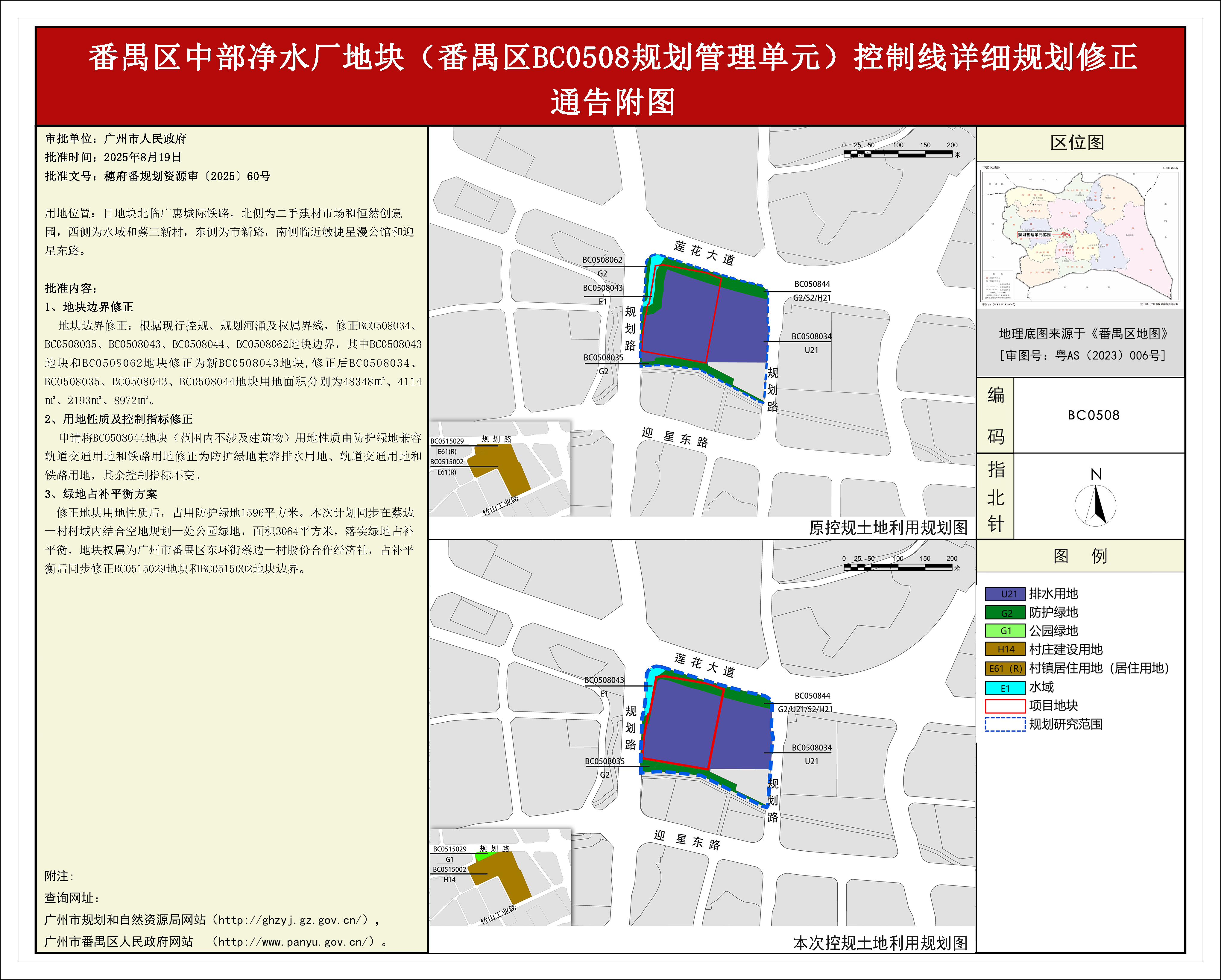 根據《廣東省城市控制性詳細規劃管理條例》、《廣州市人民政府關于將一批市級行政職權事項繼續委托區實施的決定》(穗府〔2019〕8號),《番禺區中部凈水廠地塊(番禺區BC0508規劃管理單元)控制性詳細規劃修正》規劃成果已完成規劃技術審查、批前公示等程序,并經番禺區政府常務會議審議通過后獲廣州市人民政府批準,自批準之日(2025年8月19日)起生效。