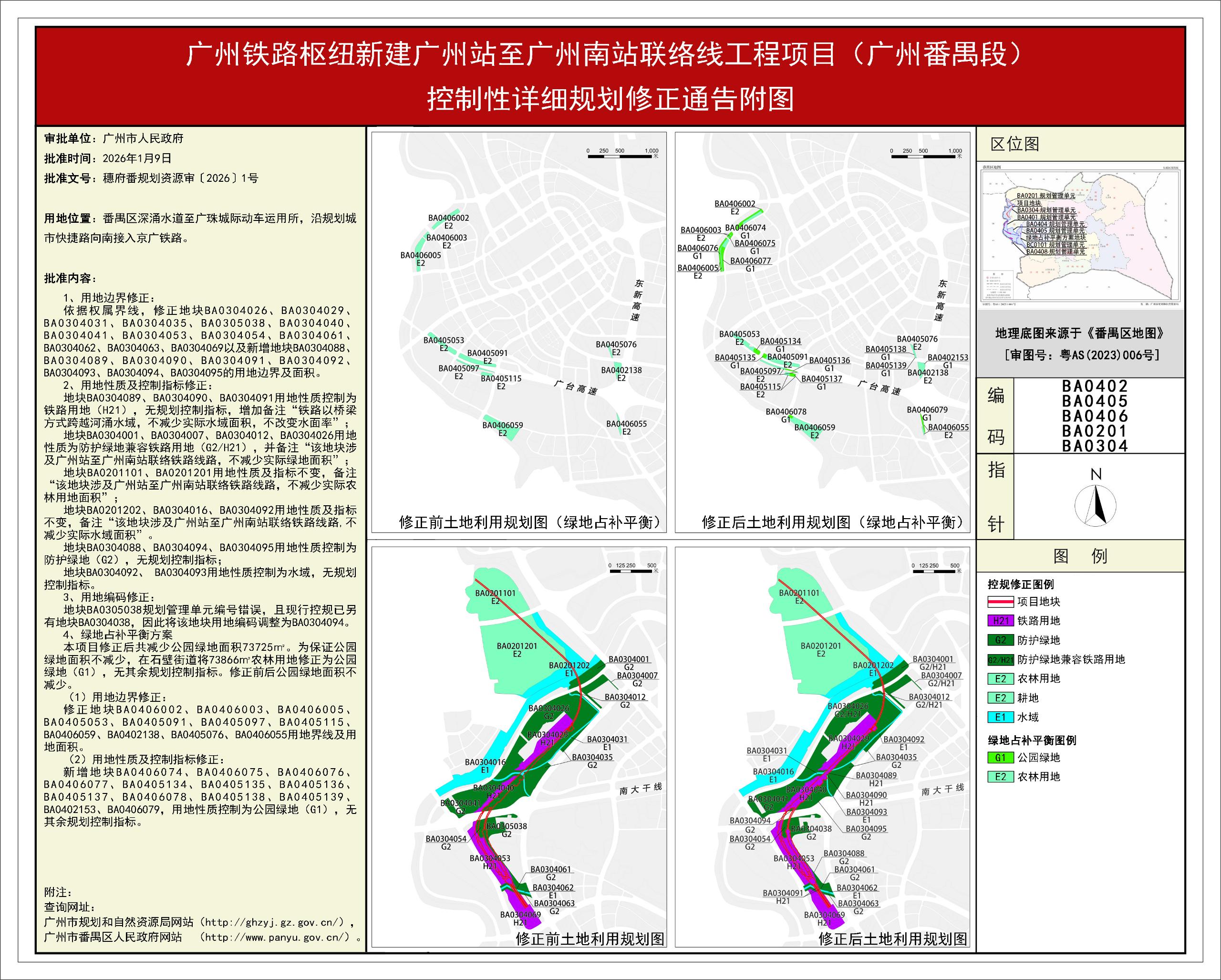 根據《廣東省城市控制性詳細規劃管理條例》、《廣州市人民政府關于將一批市級行政職權事項繼續委托區實施的決定》(穗府〔2019〕8號)、《廣州市人民政府關于收回一批市級行政權力事項的決定》(廣州市人民政府令第188號),《廣州鐵路樞紐新建廣州站至廣州南站聯絡線工程項目(廣州番禺段)控制性詳細規劃修正》規劃成果已完成規劃技術審查、批前公示、征詢相關單位意見等程序,并經廣州市番禺區土地和規劃工作專題會議2025年度第5次會議審議通過后獲廣州市人民政府批準(穗府番規劃資源審〔2026〕1號),自批準之日(2026年1月9日)起生效。