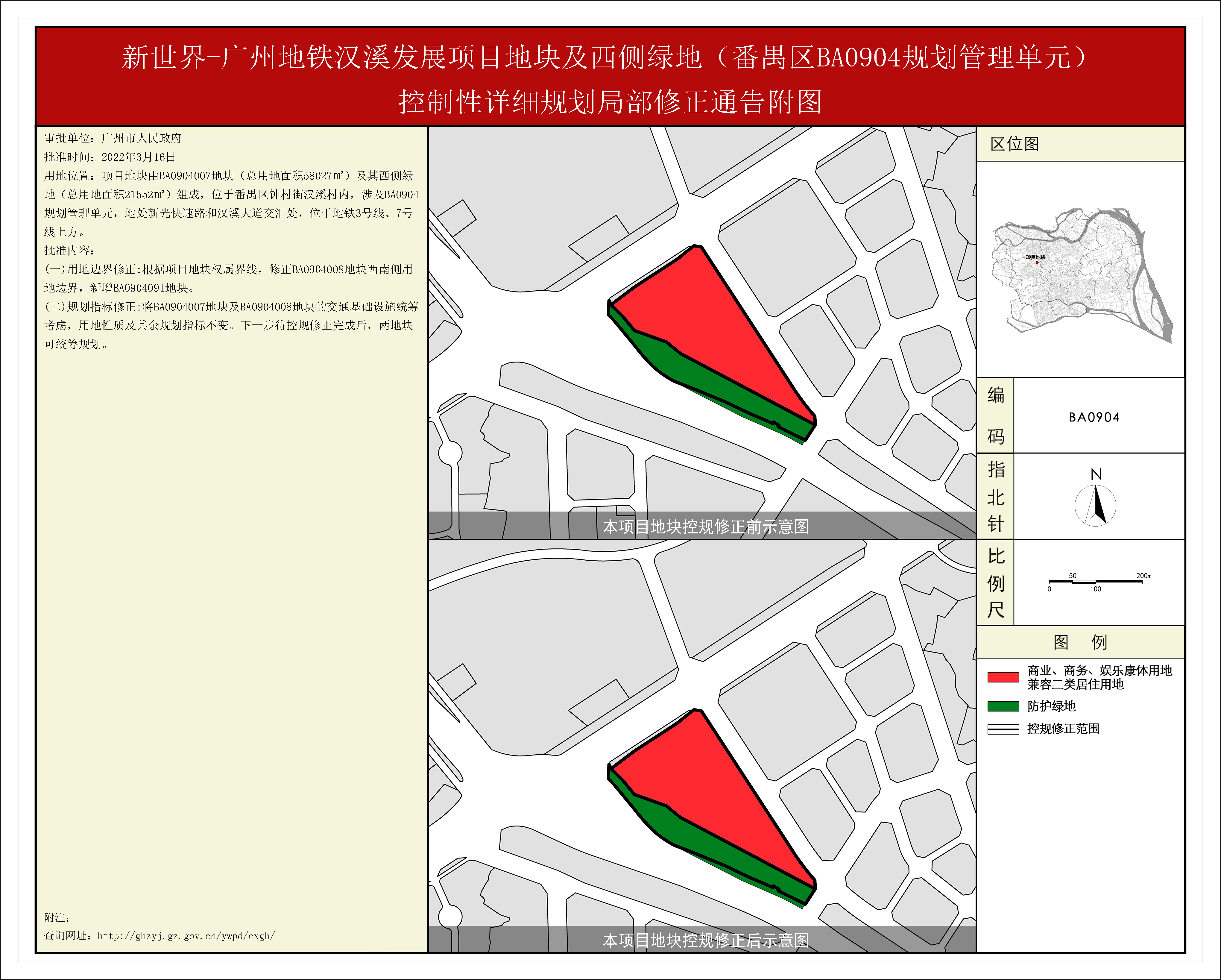 根據《廣東省城市控制性詳細規劃管理條例》、《廣州市人民政府關于將一批市級行政職權事項繼續委托區實施的決定》(穗府[2019]8號),《新世界-廣州地鐵漢溪發展項目地塊及西側綠地(番禺區BA0904規劃管理單元)控制性詳細規劃局部修正》規劃成果已完成規劃技術審查、批前公示等程序,并經番禺區土地和規劃領導小組會議審議通過后獲廣州市人民政府批準,自批準之日(2022年3月16日)起生效。