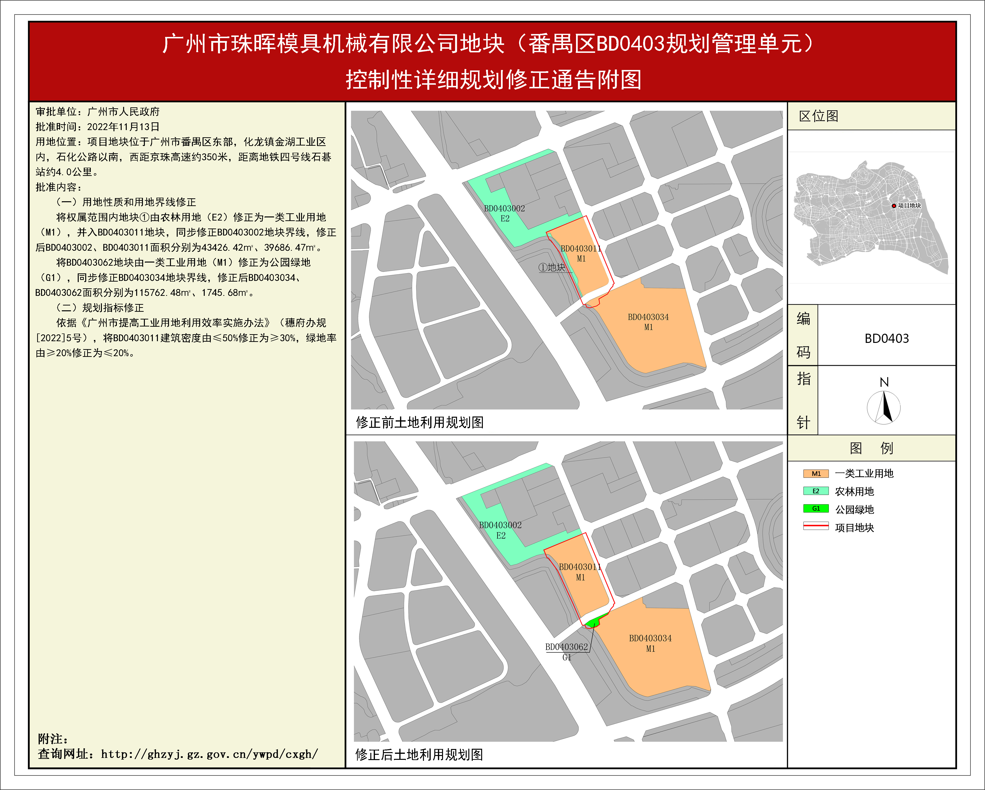 根據(jù)《廣東省城市控制性詳細(xì)規(guī)劃管理條例》、《廣州市人民政府關(guān)于將一批市級行政職權(quán)事項繼續(xù)委托區(qū)實施的決定》(穗府[2019]8號)及《廣州市人民政府關(guān)于收回一批市級行政權(quán)力事項的決定》(第188號), 《廣州市珠暉模具機械有限公司地塊(番禺區(qū)BD0403規(guī)劃管理單元)控制性詳細(xì)規(guī)劃修正》規(guī)劃成果已完成規(guī)劃技術(shù)審查、批前公示等程序,并經(jīng)番禺區(qū)土地和規(guī)劃領(lǐng)導(dǎo)小組會議審議通過后獲廣州市人民政府批準(zhǔn),自批準(zhǔn)之日(2022年11月13日)起生效。
