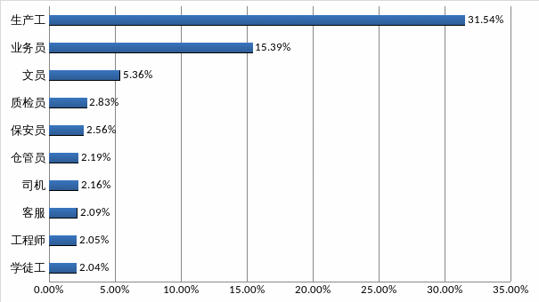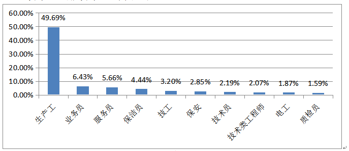 2021年,用人單位需求較大排名前三位的工種為生產(chǎn)工、業(yè)務(wù)員、文員,分別占工種總需求的31.54%、15.39%、5.36%,其中生產(chǎn)工的需求同比上升2.05%,業(yè)務(wù)員的需求同比下降1.88%,文員的需求同比上升0.10%。