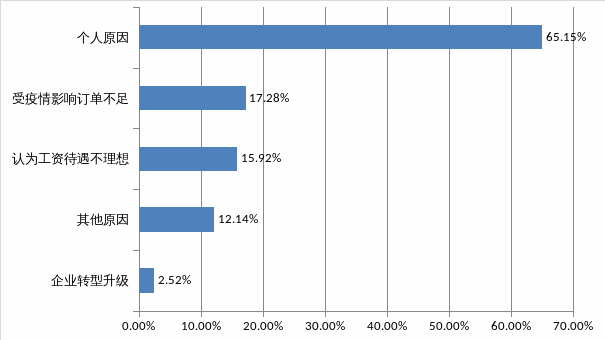 企業(yè)人員流失原因選“個人原因”的有65.15%,選“受疫情影響訂單不足”的有17.28%,選“認(rèn)為工資待遇不理想”的有15.92%,選“其他原因”的有12.14%,選“企業(yè)轉(zhuǎn)型升級”的有2.52%。造成人員流失的主要是員工個人原因。