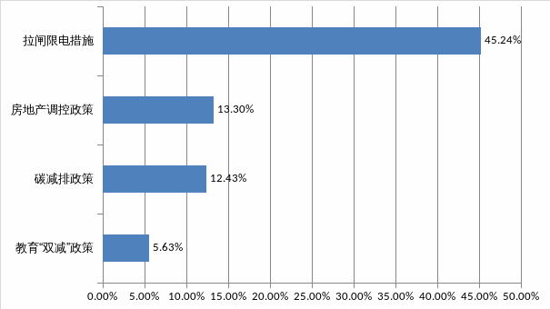 2021年,1030家企業(yè)經(jīng)營主要受到以下政策的影響:“拉閘限電措施”“房地產(chǎn)調(diào)控政策”“碳減排政策”,分別有45.24%、13.30%、12.43%的企業(yè)受到以上政策影響。