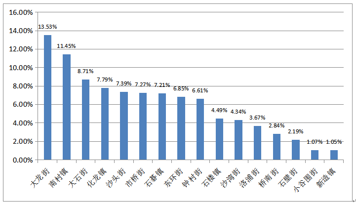 2021年第四季度末,我區(qū)外來務(wù)工人員按就業(yè)地劃分,人數(shù)排名前三的鎮(zhèn)(街)是大龍街、南村鎮(zhèn)、大石街,占我區(qū)外來務(wù)工人員總數(shù)的比例分別為13.53%、11.45%、8.71%。總體排名跟上季度相比沒有明顯變化。
