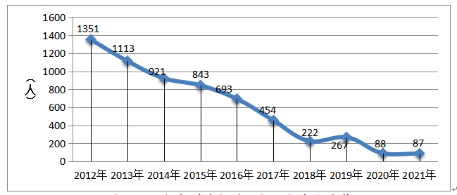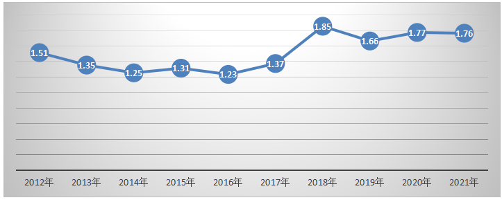 2021年,用工需求人數(shù)與求職人數(shù)的比率(求人倍率)為1.76,同比下降0.01,即從2020年平均1.77個崗位對應(yīng)1名求職者,下降到2021年平均1.76個崗位對應(yīng)1名求職者。