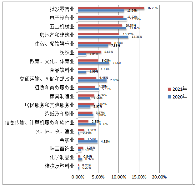 2021年,批發(fā)零售業(yè)、電子設(shè)備業(yè)、五金機械業(yè)占用工需求的前三位。用工需求同比變化較大的行業(yè)有:批發(fā)零售業(yè),同比上升4.99%;紡織業(yè),同比上升3.64%;金融業(yè),同比下降3.32%。