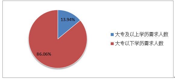 2021年,用人單位對大專及以上學(xué)歷人員的需求占用工需求總量的13.94%,同比下降2.74%。