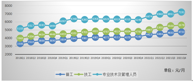 2021年第四季度末,企業(yè)在崗員工中,普工的平均工資為4733元/月,同比上升13.77%;技工的平均工資為5578元/月,同比上升16.38%;專業(yè)技術(shù)及管理人員的平均工資為7191元/月,同比上升15.15%。