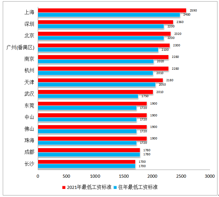 截至2021年末,十四個重點城市中有十二個城市的企業(yè)最低工資標(biāo)準(zhǔn)上調(diào),上海市為2590元/月,同比提高了4.44%;深圳市為2360元/月,同比提高了7.27%;北京市為2320元/月,同比提高了5.45%;南京市為2280元/月,同比提高12.87%;杭州市為2280元/月,同比提高13.43%;天津市為2180元/月,同比提高了6.34%;武漢市為2010元/月,同比提高14.86%;東莞市、中山市、佛山市、珠海市均為1900元/月,同比提高了10.47%。番禺區(qū)企業(yè)最低工資執(zhí)行廣州市的標(biāo)準(zhǔn)為2300元/月,同比提高了9.52%,非全日制職工小時最低工資標(biāo)準(zhǔn)調(diào)整為22.2元/小時。其他地區(qū)不變。