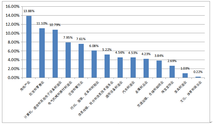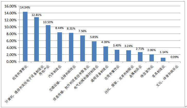 14個行業(yè)中,每個行業(yè)流失人數(shù)占流失總?cè)藬?shù)比例排名前三的是:批發(fā)和零售業(yè),計算機、通信和其他電子設(shè)備制造業(yè),房地產(chǎn)業(yè),分別占比14.34%、12.81%、10.53%;占比最低的是文化、體育和娛樂業(yè),為0.09%。