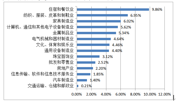 企業(yè)在第四季度內(nèi)已招聘了5669人,實際缺工總?cè)藬?shù)為5712人。實際缺工總?cè)藬?shù)與在崗總?cè)藬?shù)之比(缺工率)為3.36%。14個行業(yè)中,缺工率排名前三的是:住宿和餐飲業(yè),紡織、服裝、皮革和制鞋業(yè),家具制造業(yè),分別為9.86%、6.95%、6.02%。缺工率最低的是交通運輸、倉儲和郵政業(yè),為0.21%。