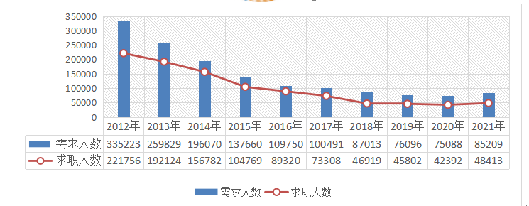 2021年,用人單位登記招聘各類人員85209人次,同比增加13.48%。求職人數(shù)為48413人次,同比增加14.20%。