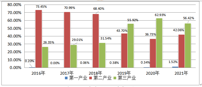 2021年,第一產(chǎn)業(yè)用工需求比例為1.52%,同比上升1.18%;第二產(chǎn)業(yè)用工需求比例為42.06%,同比上升5.33%;第三產(chǎn)業(yè)用工需求比例為56.42%,同比下降6.51%。