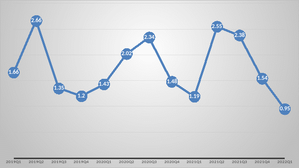 2022年第一季度,用工需求人數與求職人數的比率(求人倍率)為0.95,同比下降0.24,即從2021年平均1.19個崗位對應1名求職者,下降到今年平均0.95個崗位對應1名求職者。
