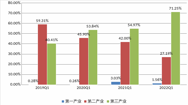 2022年第一季度,第一產業用工需求比例為1.56%,同比下降1.47%;第二產業用工需求比例為27.19%,同比下降14.81%;第三產業用工需求比例為71.25%,同比上升16.28%。