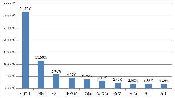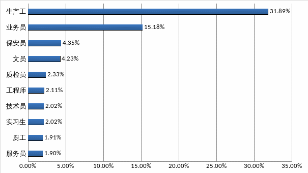 2022年第一季度,用人單位需求較大排名前三位的工種為生產工、業務員、保安員,分別占工種總需求的31.89%、15.18%、4.35%,其中生產工的需求同比上升0.16%,業務員的需求同比下降2.00%,保安員的需求同比上升1.93%。