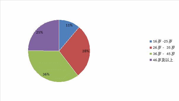 2022年第一季度,求職者按年齡段劃分:16歲至25歲占比11%,26歲至35歲占比28%,36歲至45歲占比36%,46歲及以上占比25%。