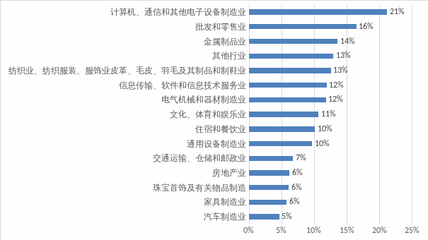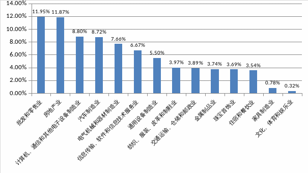 2022年第一季度,14個行業中用工量占比排名前三的是:批發和零售業,房地產業,計算機、通信和其他電子設備制造業,分別占用工總量11.95%、11.87%、8.80%。用工量最少的是文化、體育和娛樂業,占用工總量0.32%。用工量變化大的行業有房地產業,同比增長了4.78%,其他行業用工量變化較小。