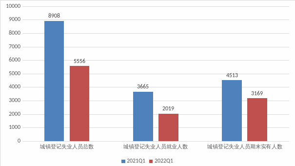 2022年初至2022年第一季度末,城鎮登記失業人員就業人數2019人,同比減少44.91%。