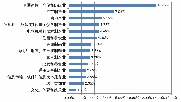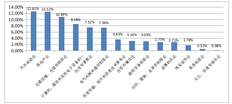 14個行業中,每個行業流失人數占流失總人數比例排名前三的是:汽車制造業,房地產業,交通運輸、倉儲和郵政業,分別占比12.61%、12.52%、10.89%;占比最低的是文化、體育和娛樂業,為0.08%。