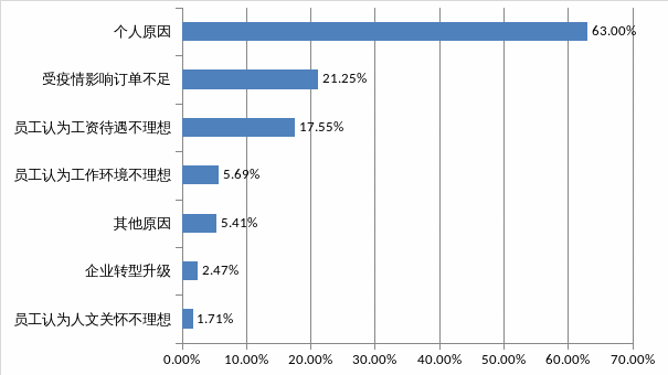 企業人員流失原因排名前三的是:個人原因,有63.00%企業選擇;受疫情影響訂單不足,有21.25%企業選擇,員工認為工資待遇不理想,有17.55%企業選擇。