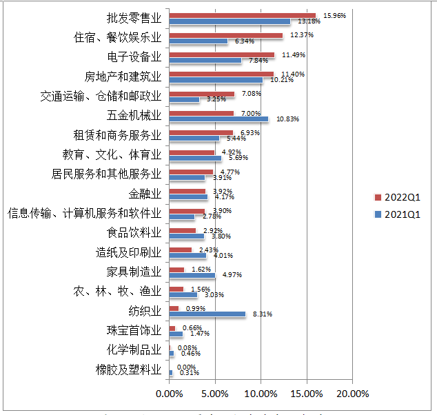 2022年第一季度,批發零售業、住宿餐飲娛樂業、電子設備業占用工需求的前三位。用工需求同比變化較大的行業有:住宿餐飲娛樂業,同比上升6.03%;交通運輸、倉儲和郵政業,同比上升3.83%;電子設備業,同比上升3.65%;紡織業,同比下降7.32%;五金機械業,同比下降3.83%;家具制造業,同比下降3.35%。