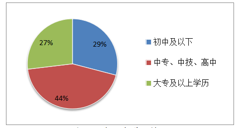 2022年第一季度,求職者按學歷劃分:初中及以下學歷占比29%,中專、中技、高中學歷占比44%,大專及以上學歷占比27%。