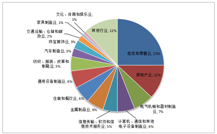 2022年第一季度,我區1054家就業失業情況動態監測企業主要分為14個行業,分別是:批發和零售業,房地產業,電氣機械和器材制造業,計算機、通信和其他電子設備制造業,信息傳輸、軟件和信息技術服務業,金屬制品業,住宿和餐飲業,通用設備制造業,紡織、服裝、皮革和制鞋業,汽車制造業,珠寶首飾業,交通運輸、倉儲和郵政業,家具制造業,文化、體育和娛樂業。其中,企業數量最多的是“批發和零售業”,占比25%;企業數量最少的是“家具制造業”和“文化、體育和娛樂業”,占比都只有1%。