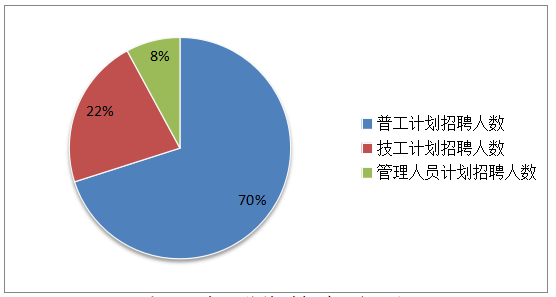 2022年第一季度,企業計劃招聘總人數為14310人,計劃招聘總人數占在崗總人數的7.96%。普工、技工、管理人員分別占計劃招聘總人數的70%、22%、8%。