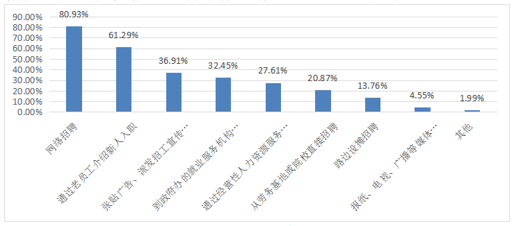 企業采用的招聘新員工方式排名前三的是:網絡招聘,有80.93%企業采用;通過老員工介紹新人入職,有61.29%企業采用;張貼廣告、派發招工宣傳單張,有36.91%企業采用。