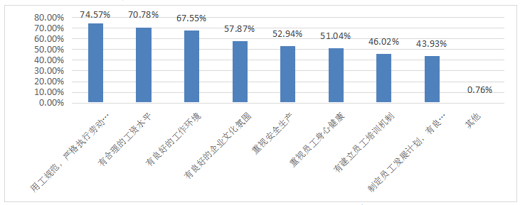 企業吸引求職者的主要優勢排名前三的是:用工規范,嚴格執行勞動法律法規和用工管理的相關規定,有74.57%企業選擇;有合理的工資水平,有70.78%企業選擇;有良好的工作環境,有67.55%企業選擇。