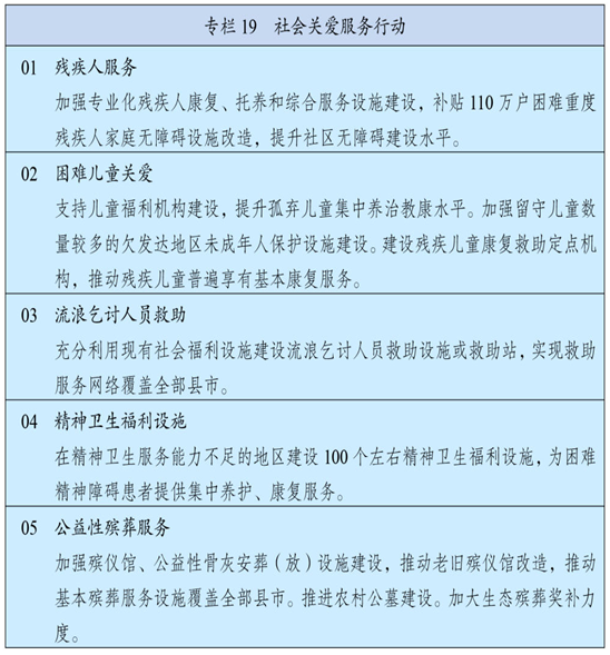 健全殘疾人幫扶制度,幫助殘疾人普遍參加基本醫療和基本養老保險,動態調整困難殘疾人生活補貼和重度殘疾人護理補貼標準。完善殘疾人就業支持體系,加強殘疾人勞動權益保障,優先為殘疾人提供職業技能培訓,扶持殘疾人自主創業。推進適齡殘疾兒童和少年教育全覆蓋,提升特殊教育質量。建成康復大學,促進康復服務市場化發展,提高康復輔助器具適配率,提升康復服務質量。開展重度殘疾人托養照護服務。加強殘疾人服務設施和綜合服務能力建設,完善無障礙環境建設和維護政策體系,支持困難殘疾人家庭無障礙設施改造。