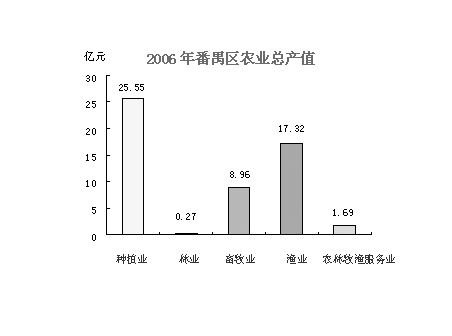 農(nóng)業(yè)生產(chǎn)在結(jié)構(gòu)調(diào)整中平穩(wěn)發(fā)展。通過大力推進農(nóng)業(yè)產(chǎn)業(yè)化、機械化、標準化和現(xiàn)代化,傳統(tǒng)型農(nóng)業(yè)逐步向現(xiàn)代都市型農(nóng)業(yè)轉(zhuǎn)變。2006年,番禺區(qū)農(nóng)業(yè)總產(chǎn)值53.78億元,增長6.2%。其中,種植業(yè)產(chǎn)值25.55億元,增長3.7%;畜牧業(yè)產(chǎn)值8.96億元,下降0.8%;漁業(yè)產(chǎn)值17.32億元,增長 11.3%。