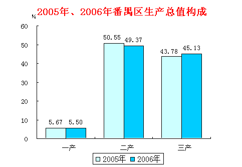 國民經(jīng)濟保持快速增長。據(jù)初步統(tǒng)計,2006年番禺區(qū)生產(chǎn)總值546.94億元,增長12.5%。其中,第一產(chǎn)業(yè)增加值30.06億元,增長6.2%;第二產(chǎn)業(yè)增加值270.03億元,增長10.1%;第三產(chǎn)業(yè)增加值246.85億元,增長16.2%。在第二產(chǎn)業(yè)中,工業(yè)增加值238.17億元,增長13.9%。三次產(chǎn)業(yè)比重由上年的5.67:50.55:43.78調(diào)整為5.50:49.37:45.13。人均生產(chǎn)總值為58235元(按平均戶籍人口計算),合7304美元(按1美元折7.9735元人民幣匯率計算)。