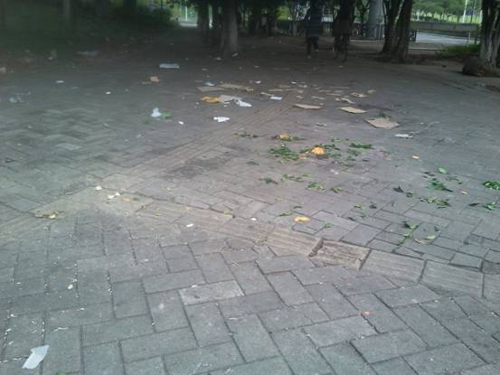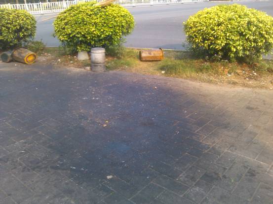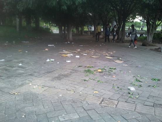 早晨上課時分路面留下的垃圾和清晰油污