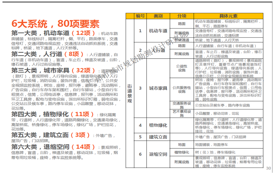 (二)全要素覆蓋、高品質(zhì)提升。根據(jù)“道路有主次,功能有分區(qū)”原則,將市政設(shè)施分為“4大系統(tǒng),43項(xiàng)要素”,對(duì)每項(xiàng)要素進(jìn)行綜合考慮和結(jié)合,改變傳統(tǒng)設(shè)計(jì)弊端,對(duì)每項(xiàng)要素提出指引和控制向?qū)В诸?lèi)控制每一類(lèi)道路的建設(shè)標(biāo)準(zhǔn)與特色,建設(shè)高品質(zhì)、高標(biāo)準(zhǔn)的示范道路。