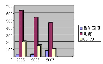區計劃生育服務站自2004年3月起開展了TORCH四項檢查,近年相繼增加了地中海貧血、G6-PD篩查等項目。三年多來,共檢查孕婦19520人,初篩陽性者中,地中海貧血1634例,G6-PD470例,TORCH147例(如圖表2所列的三年陽性例數圖),其中17