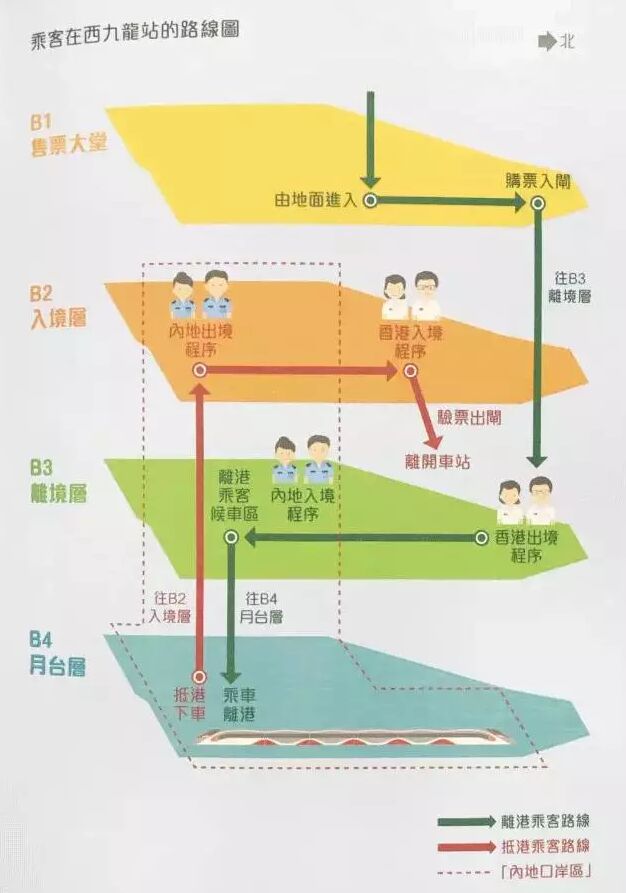 根據香港特區政府公布的方案,西九龍站將參照目前實行“一地兩檢”的深圳灣口岸模式,即乘客可在同一個地方依序辦理兩個不同管轄區的通關程序。西九龍站將實行的通關程序包括清關、出入境及檢驗檢疫手續。