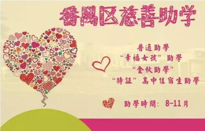 為切實幫助番禺區困難家庭子女解決上學問題,充分發揮番禺區慈善會的慈善救助職能,區慈善會定于8月-11月開展慈善助學工作。