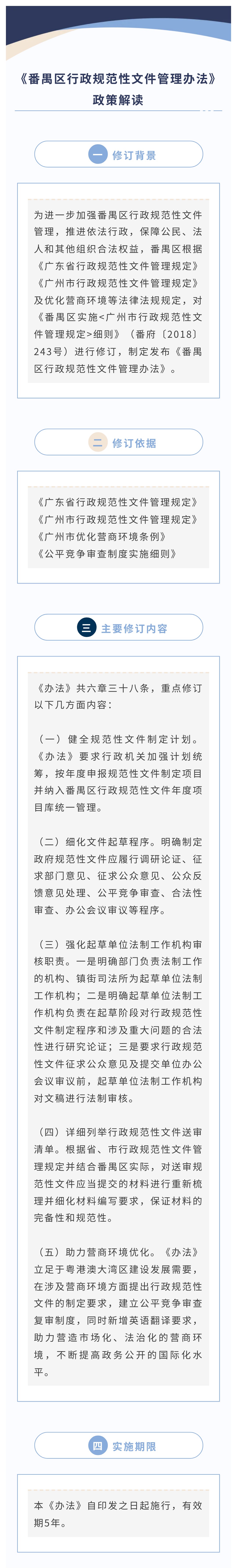 點(diǎn)擊查看相關(guān)政策原文:廣州市番禺區(qū)人民政府關(guān)于印發(fā)番禺區(qū)行政規(guī)范性文件管理辦法的通知