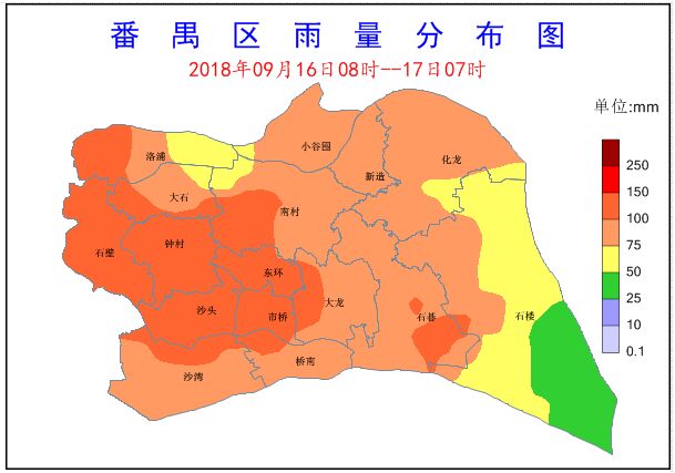 “山竹”的降雨主要在16日白天,我區(qū)普遍錄到暴雨至大暴雨。最大時雨量出現(xiàn)在沙頭街番禺國家氣象觀測站,達到31.9毫米。橋南、沙頭、市橋、東環(huán)、鐘村、大石、石壁、洛浦及南村等9個鎮(zhèn)街的12個氣象觀測站錄到大暴雨,最大累積降雨量出現(xiàn)在鐘村街,達到130.9毫米。